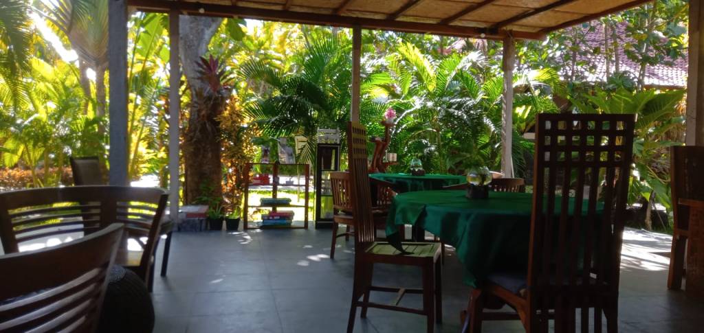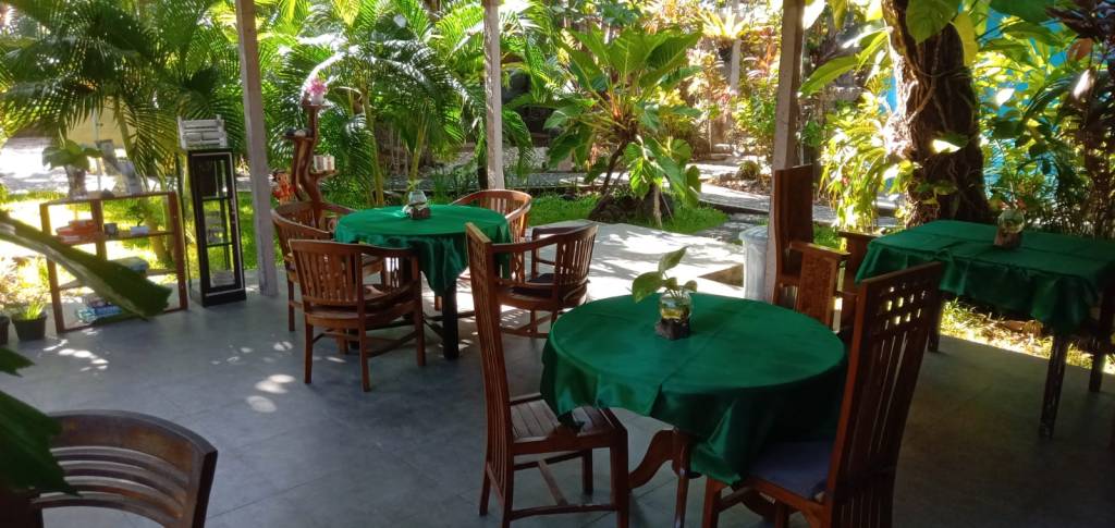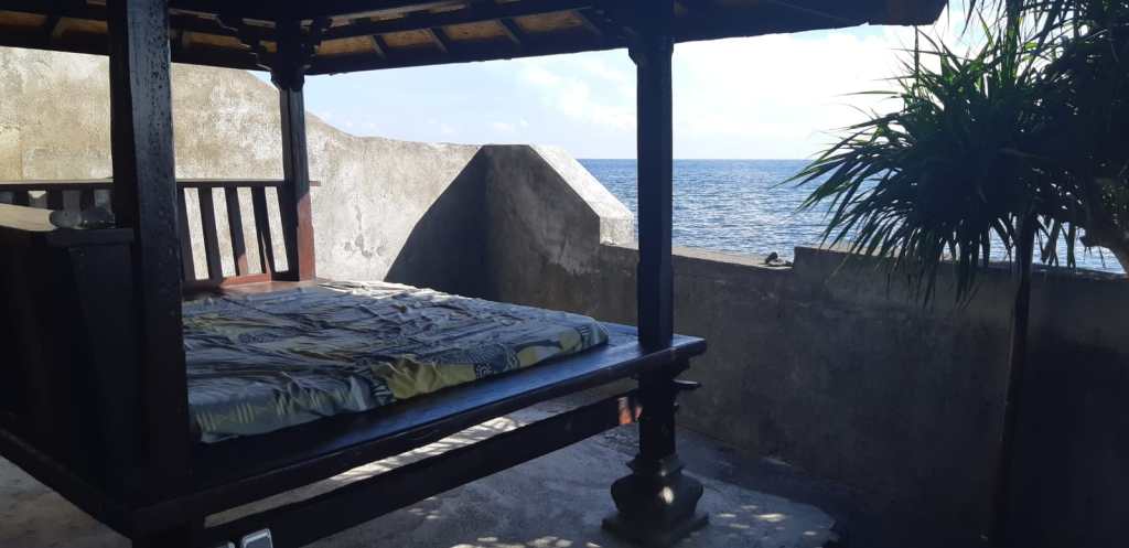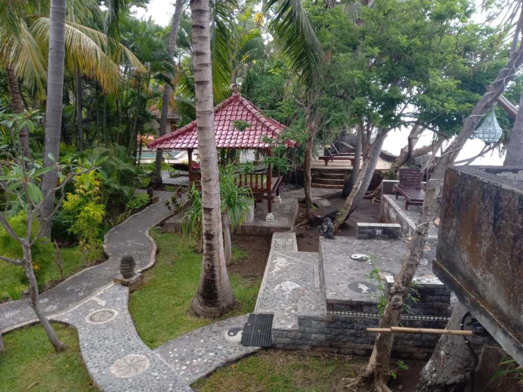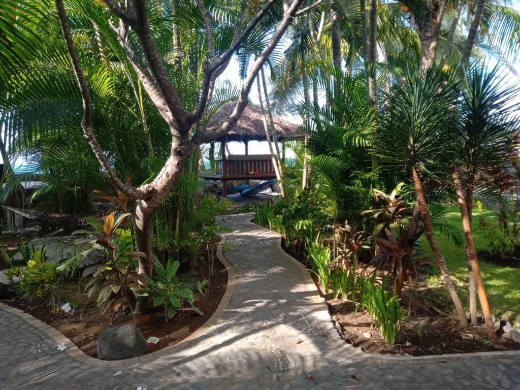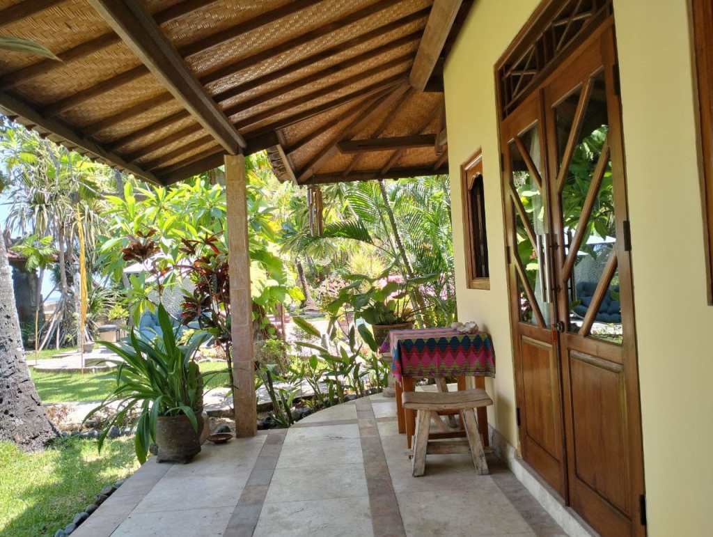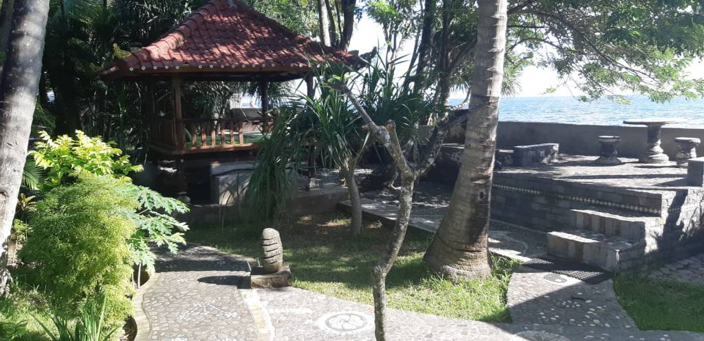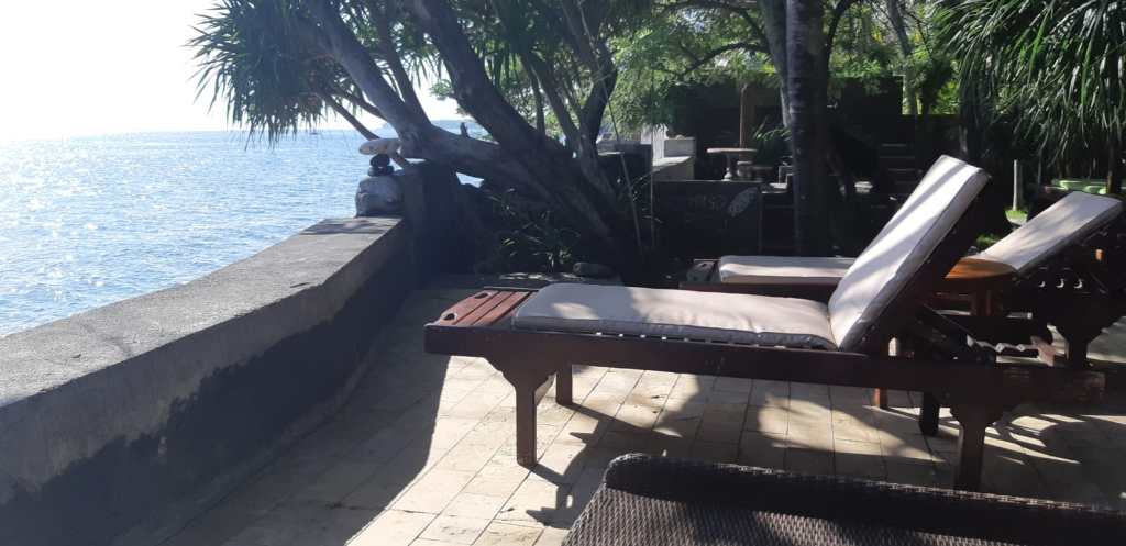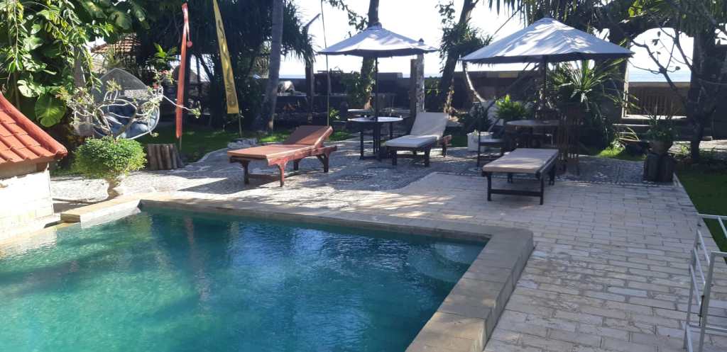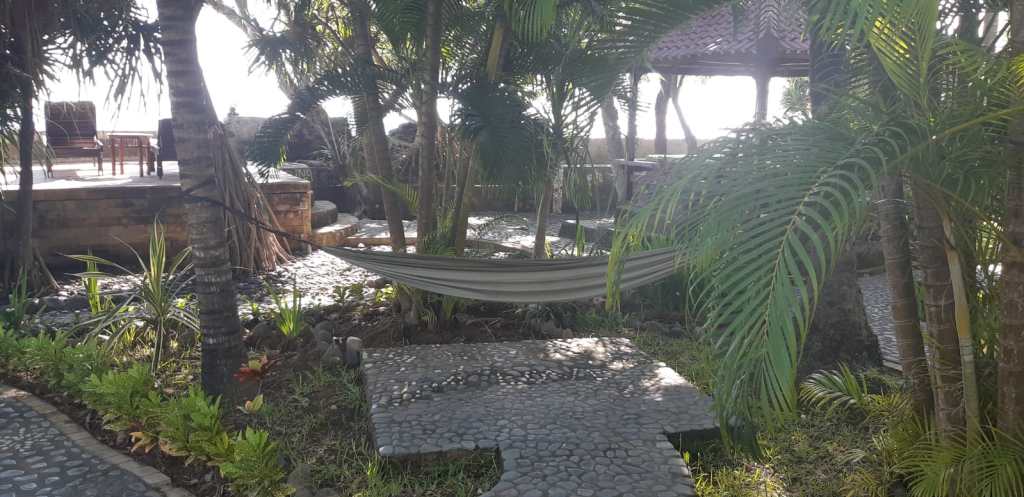 The resort has a lush tropical garden with well maintained walking paths, and several bale bengongs, where you can relax and enjoy the silence and the beauty of the garden. There is a 4×6 meter pool with shower, just before you get to the 60 meter long oceanfront. All along the oceanfront are sitting areas with chairs, barstools, or hammocks where you can enjoy the stunning view and smell the salty ocean.