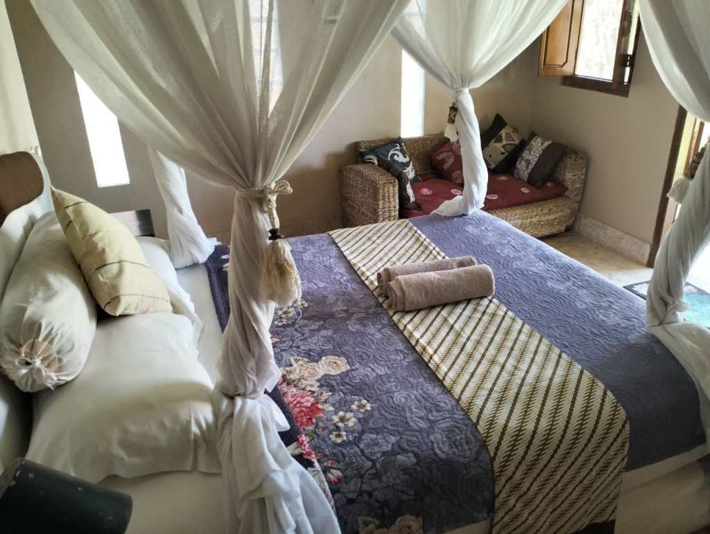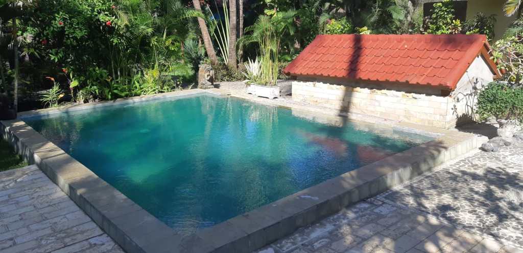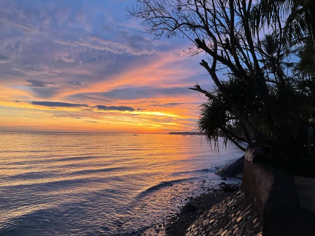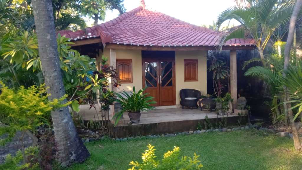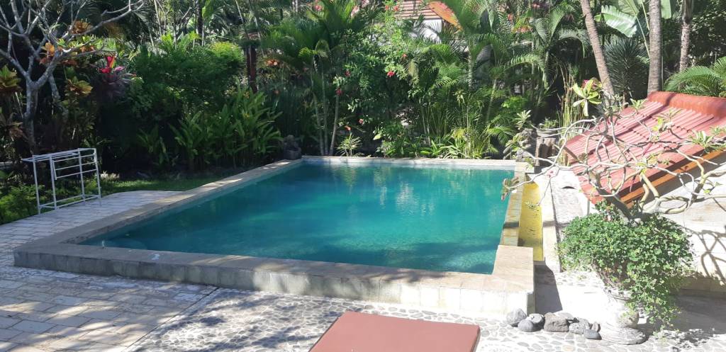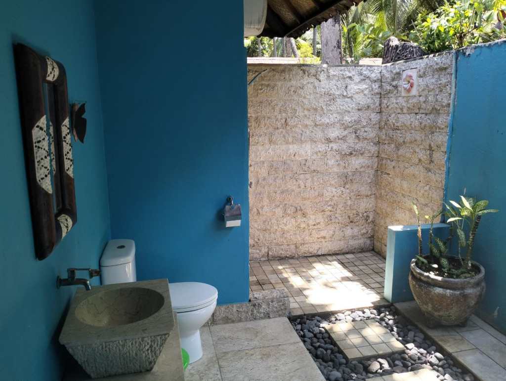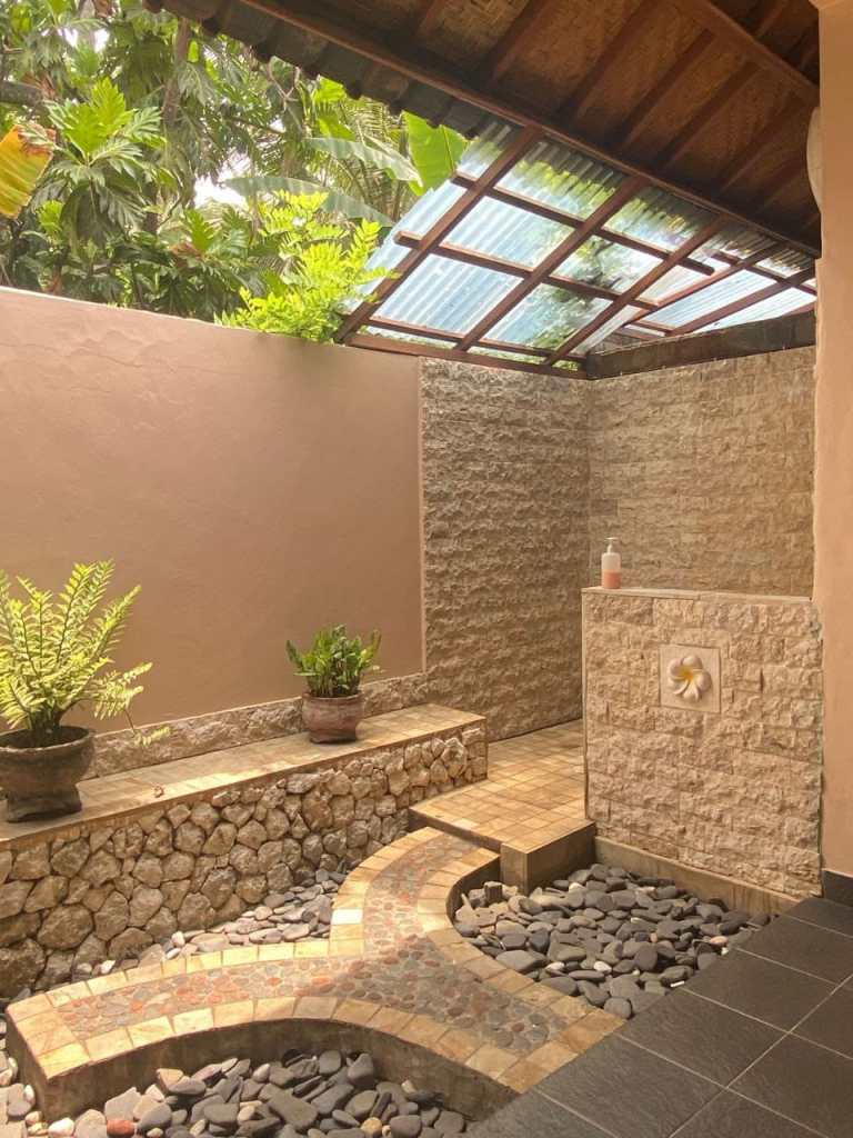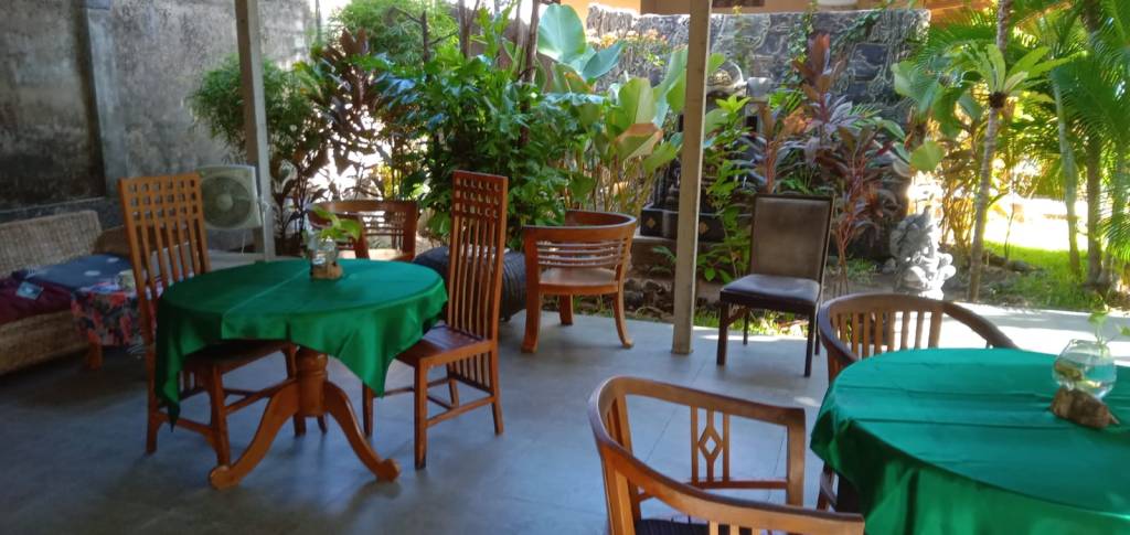 The resort has a lush tropical garden with well maintained walking paths, and several bale bengongs, where you can relax and enjoy the silence and the beauty of the garden. There is a 4×6 meter pool with shower, just before you get to the 60 meter long oceanfront. All along the oceanfront are sitting areas with chairs, barstools, or hammocks where you can enjoy the stunning view and smell the salty ocean.