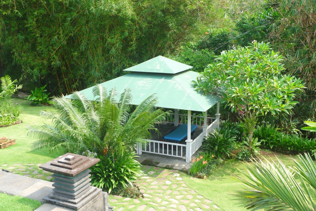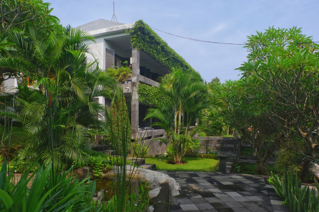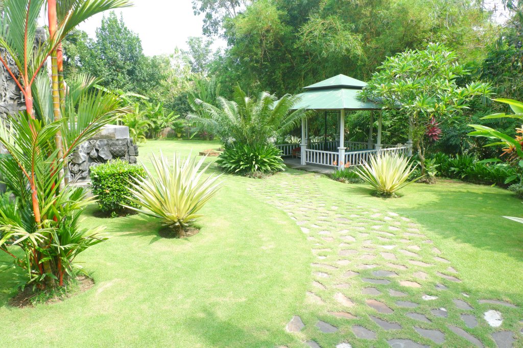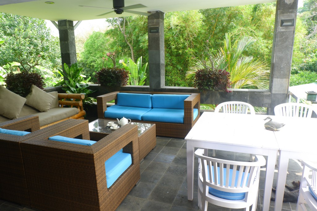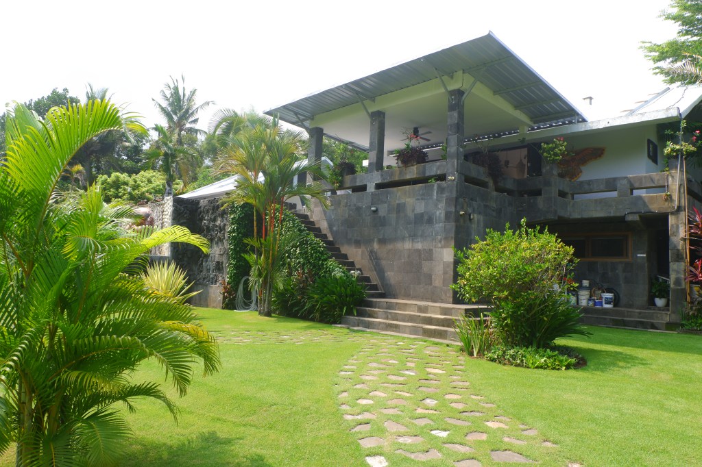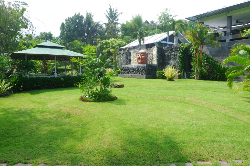 The magnificent gardens were installed by a well-known landscape artist from Java in 2012. He has included many flowing layers, retaining walls, paths, wall carvings & a giant Buddha statue over which the infinity pool cascades its water. Many species of local & imported plants, shrubs fruits & now mature trees were planted with wonderful results.