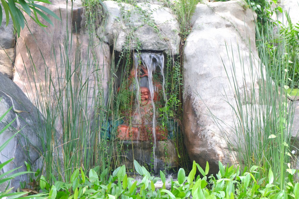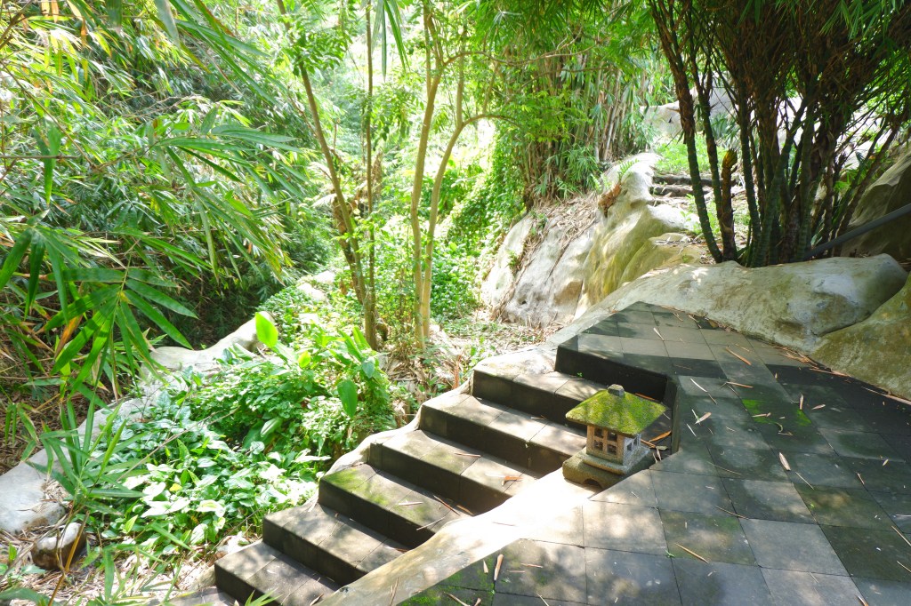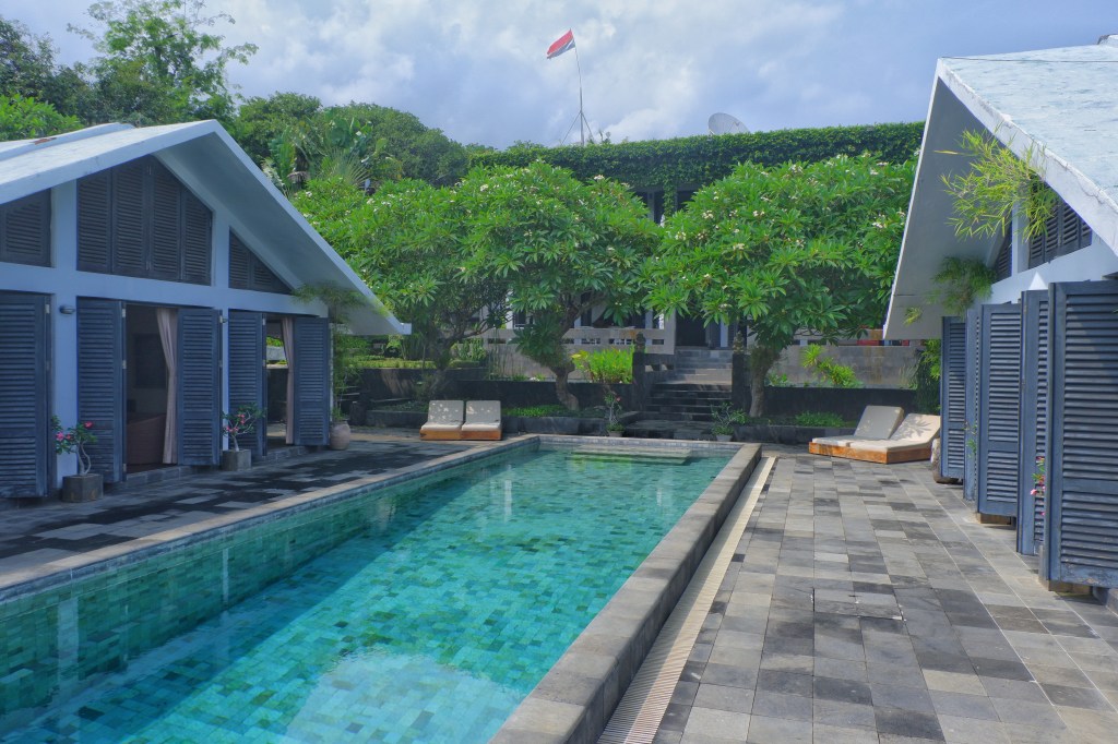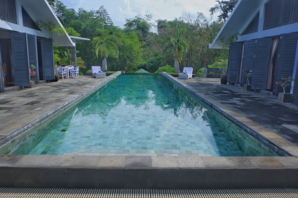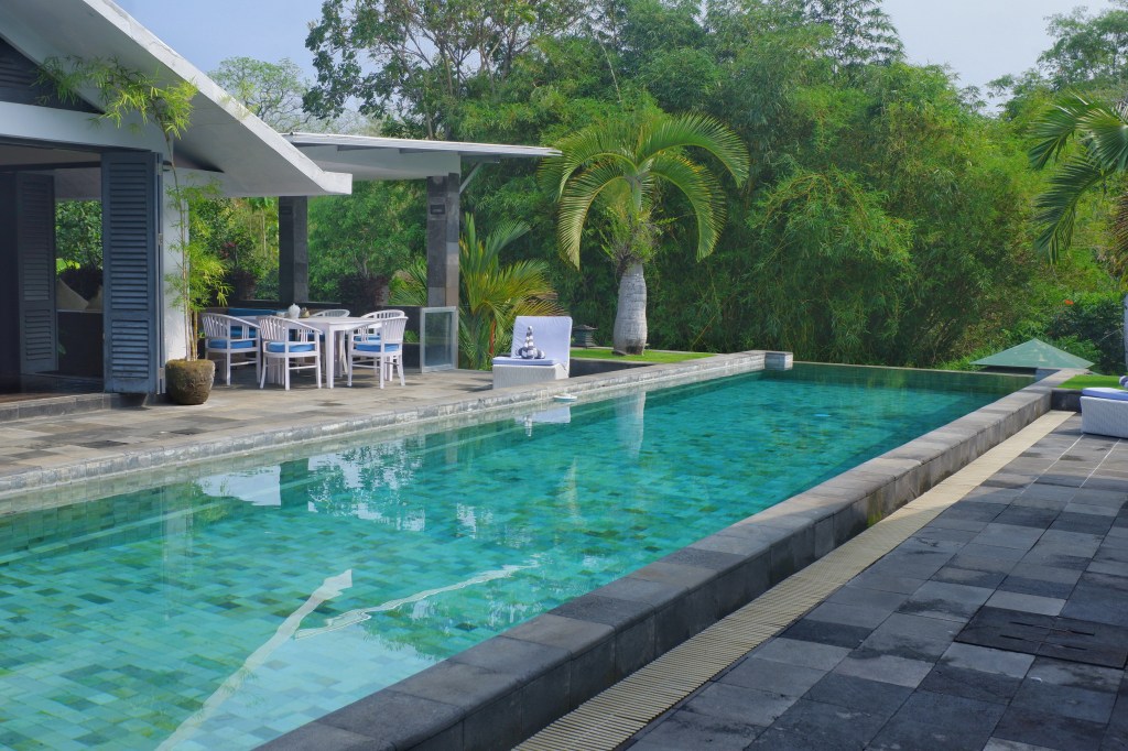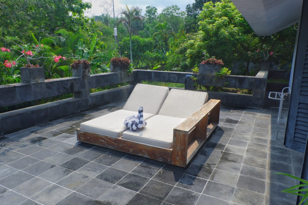 The magnificent gardens were installed by a well-known landscape artist from Java in 2012. He has included many flowing layers, retaining walls, paths, wall carvings & a giant Buddha statue over which the infinity pool cascades its water. Many species of local & imported plants, shrubs fruits & now mature trees were planted with wonderful results.
