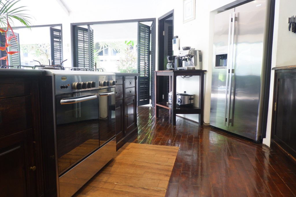 On the properties, the central level is two pavilions of over 80m each, with a large 18-meter x 5-meter marble tiled pool in between. One pavilion gives room to a large western equipped kitchen with dining, pantry, powder room/toilet, large gas oven/cooktop & alfresco dining area (25 sqr/meters) with wall mounted flat screen TV, lighting, ceiling fan, etc. & views out over the gardens & pool. The other is a super large pool pavilion with plenty of wardrobes, room safe and large marble lined bathroom with twin carved stone hand basins, large twin door shower, toilet, etc. On a lower level is a fifth and very large family room (over 90 sqr/meters with extra-large ensuite & storage, a king size & queen size bed & private courtyard terrace. Also a new 2Kw air conditioner & private terrace/courtyard.