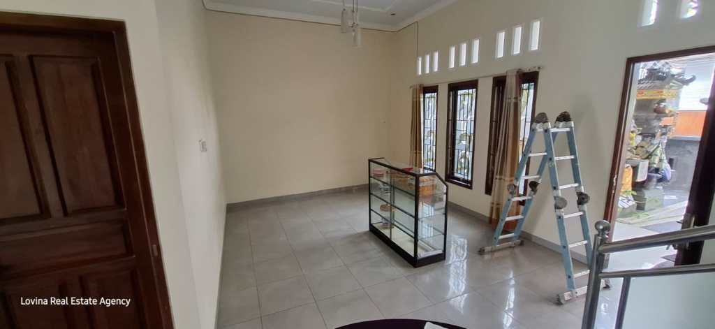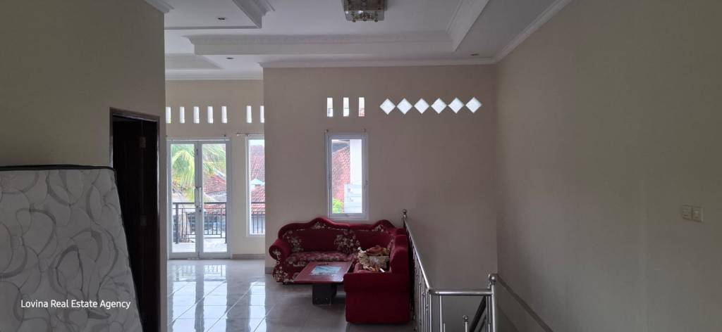 This well maintained 2 story Villa is located in Pemaron. In the front of the Villa there is a parking area and a beautiful small balinese temple set up. From there you can enter the very spacious living room, also on the first floor you can find an open kitchen and an air conditioned master bedroom with ensuite bathroom. Underneath the stairs there is a clever made cupboard/showcase.