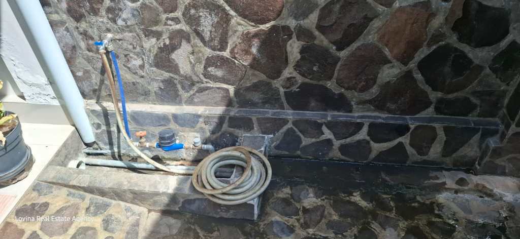 Outside on the back of the villa is an additional setup with cupboards and tiles which can be used as an outdoor kitchen.