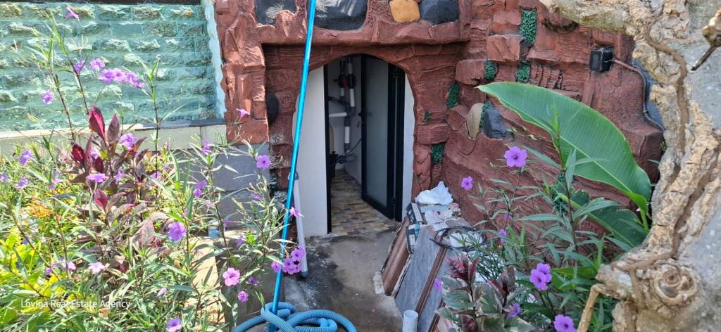 There is a special bathroom building in the garden, shaped like a cave in a rock, so you can shower or use the toilet without making the whole villa wet.